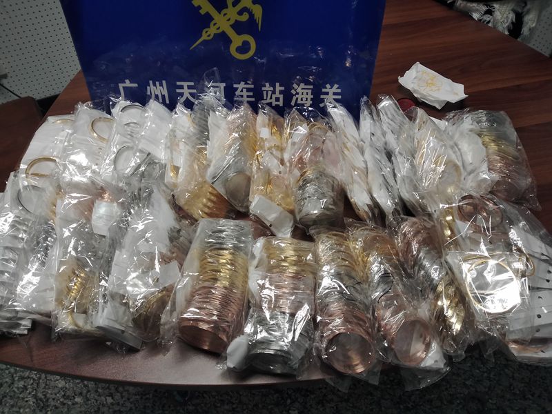 11月25日上午,天河車站海關(guān)關(guān)員在一名出境旅客隨身行李中查獲未向海關(guān)申報的“Cattier”、“Hermes”、“Chanel”、“Gucci”等知名品牌的手鐲,這批手鐲做工低劣,包裝簡陋,共計482件,涉嫌侵犯卡地亞、愛馬仕、香奈兒、古馳等8個知名品牌的知識產(chǎn)權(quán)。據(jù)當事人稱,該批手鐲總價僅3800元,無法提供相關(guān)知識產(chǎn)權(quán)證明。