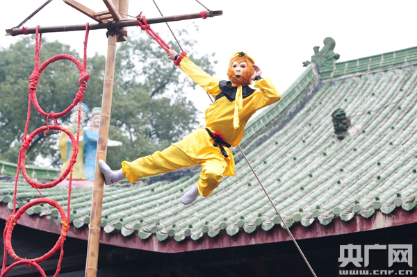 “‘石蟆百戲伎藝’表演是重慶市級非物質文化遺產項目,是流傳在江津區(qū)石蟆鎮(zhèn)、白沙鎮(zhèn)一帶的傳統(tǒng)綜合性表演藝術,尤以石蟆地區(qū)傳承的技藝堪稱代表。主要包括橦技(竿技,俗稱猴子爬桿)、獅舞(俗稱翻五臺)、大頭和尚以及小雜耍、幻術(魔術)等樣式。我們力求將這些非遺文化保護與發(fā)展地方經濟相結合,希望清源官感恩惜福的文化傳統(tǒng)得到繼承和發(fā)揚!笔℃(zhèn)有關負責人告訴記者。