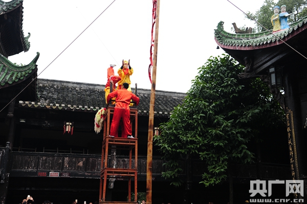 央廣網重慶12月3日消息(記者劉湛 通訊員程雅琦)重慶市江津區(qū)石蟆鎮(zhèn)第三屆清源宮廟會昨天盛大開幕。來自重慶四川、貴州的4萬游客相聚石蟆鎮(zhèn),參加一年一度的盛會—— 石蟆清源宮燈桿會!昂镒优罈U”、“高空舞獅”、“打錢槍”、“蓮花鬧”、“唱川戲”等當地獨具特色的“非遺”表演,讓游客一飽眼福。