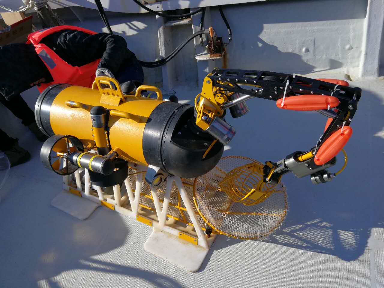 科研人員在船上一邊觀看著顯示器,一邊遙控機(jī)器人在水下行動(dòng)。機(jī)器人身上自帶攝像頭,操作人員在顯示器上可以清晰的看到水下的情況。機(jī)器人來到了20多米深的海底,經(jīng)過一番尋找,機(jī)器人找了海參,通過操作者的遙控指揮,機(jī)器人將海參捕獲,并放入袋中。完成海參采捕任務(wù)后,水下智能機(jī)器人浮上海面,重新放回船上,試驗(yàn)成功。