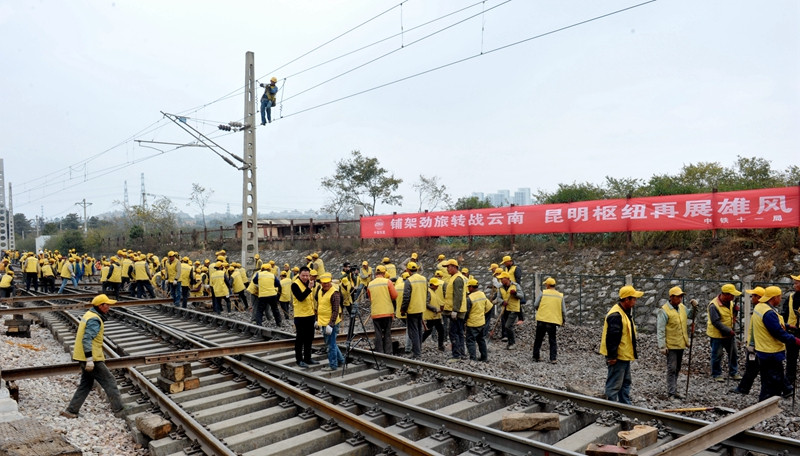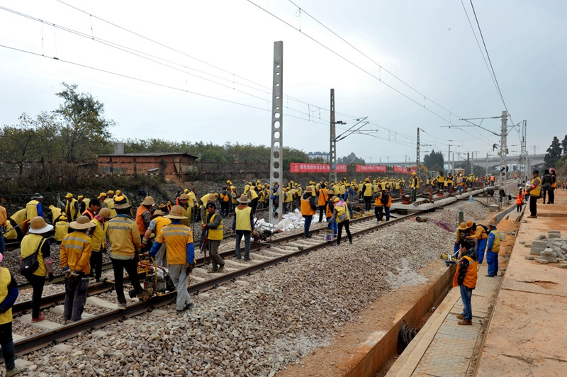此次“龍口”撥接施工,昆明鐵路樞紐建設(shè)指揮部、中鐵十一局三公司、中國鐵建電氣化局北方公司等單位組織了近千名人員參加會戰(zhàn),現(xiàn)場人頭攢動,機(jī)械轟鳴。