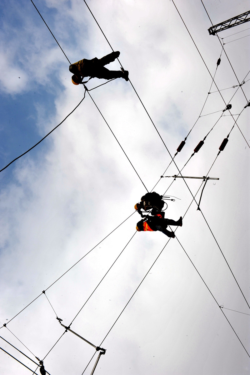 中國鐵建電氣化局北方公司架接接觸網(wǎng)。張偉明攝影