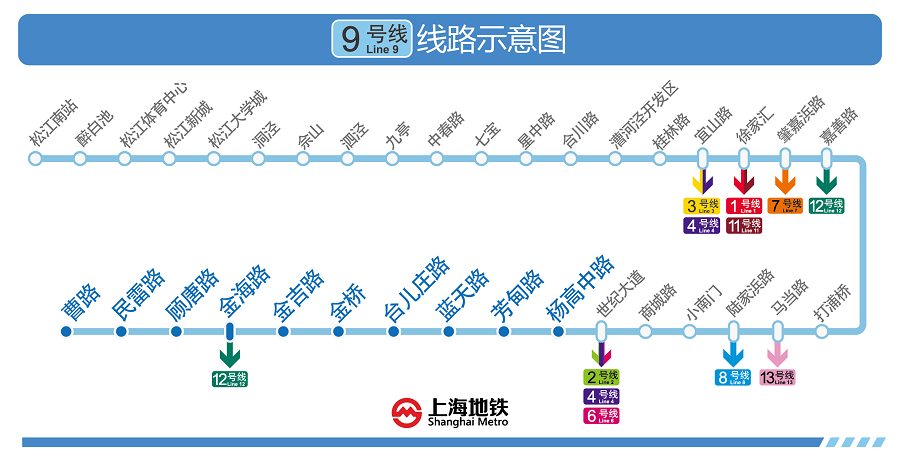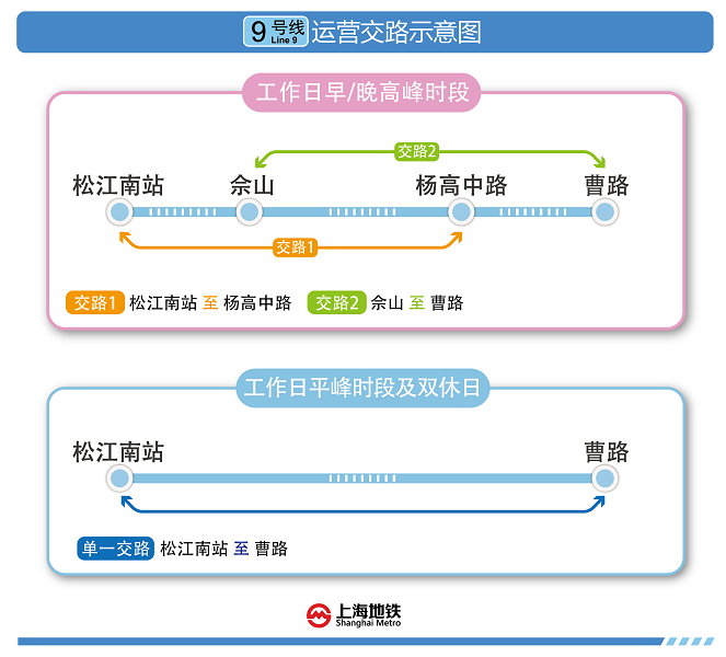 屆時(shí),工作日早晚高峰時(shí)段9號(hào)線列車開行雙交路,兩個(gè)交路分別為:松江南站站——楊高中路站,佘山站——曹路站;工作日平峰時(shí)段及雙休日、節(jié)假日,9號(hào)線全線開行單一交路,即:松江南站站——曹路站。
