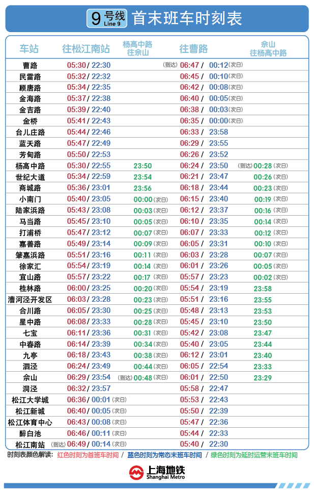 9號(hào)線三期楊高中路站——曹路站開通試運(yùn)營后,9號(hào)線浦東段終點(diǎn)站將延伸至曹路站。屆時(shí),9號(hào)線全線運(yùn)營交路和全線運(yùn)營時(shí)間均有所調(diào)整。新開通的芳甸路站往松江南站站首班車時(shí)間5:50,末班車時(shí)間22:53;芳甸路站往曹路站首班車時(shí)間6:26,末班車時(shí)間23:52;曹路站往松江南站站首班車時(shí)間5:30,末班車時(shí)間22:30。