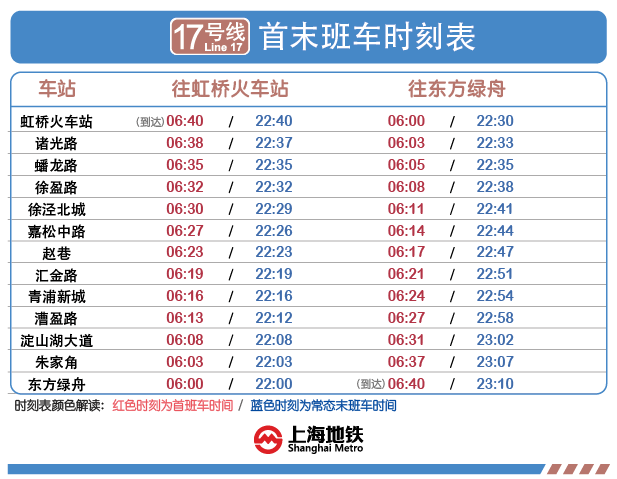 17號(hào)線東方綠舟站——虹橋火車站站開通試運(yùn)營后,全線運(yùn)營時(shí)間6:00~23:10。虹橋火車站站往東方綠舟站首班車6:00,末班車22:30;東方綠舟站往虹橋火車站站首班車為6:00,末班車為22:00。