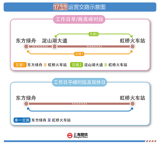 17號(hào)線虹橋火車站站——東方綠舟站開通試運(yùn)營后,工作日早晚高峰時(shí)開行大小交路,其中大交路運(yùn)行區(qū)段:東方綠舟站——虹橋火車站站;小交路運(yùn)行區(qū)段:淀山湖大道站~虹橋火車站站。工作日平峰時(shí)段及雙休日、節(jié)假日,全線開行單一交路,即:東方綠舟站~虹橋火車站站。