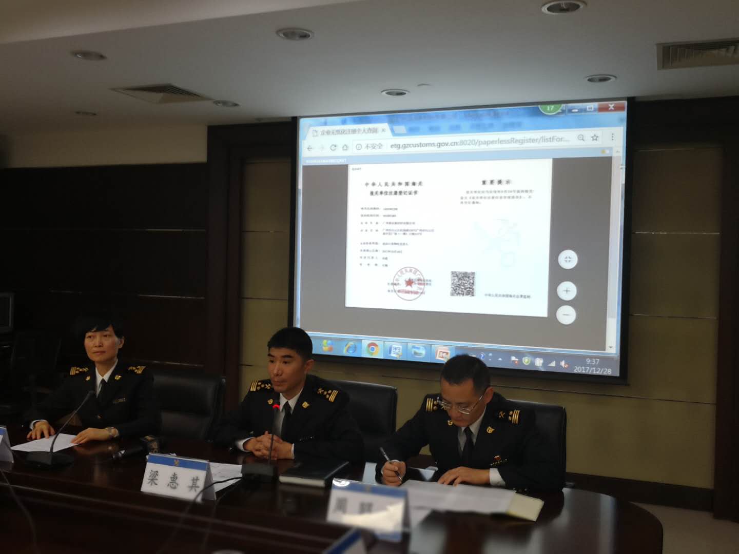 央廣網廣州12月28日消息(記者鄭澍 通訊員關悅)廣州海關28日召開新聞發(fā)布會通報“先行先試”推進企業(yè)注冊登記“無紙化”改革情況,廣州海關企業(yè)管理處處長梁惠其現(xiàn)場展示了全國第一張報關單位注冊登記的電子證書。從明年始,廣州海關將正式實施企業(yè)注冊登記“無紙化”,在全國率先推出全流程“無紙化”+“電子印章”服務。廣州海關通過“線上海關”系統(tǒng)對接廣州市商事主體信息平臺,實現(xiàn)企業(yè)信息數(shù)據(jù)的自動對碰,企業(yè)隨時隨地通過互聯(lián)網遠程向廣州海關申請辦理海關注冊登記手續(xù),系統(tǒng)審核通過后會自動加蓋電子印章,企業(yè)可以在線領取電子版注冊證書并打印,也可到海關辦事窗口領取,或由海關通過免費的郵政速遞寄達。