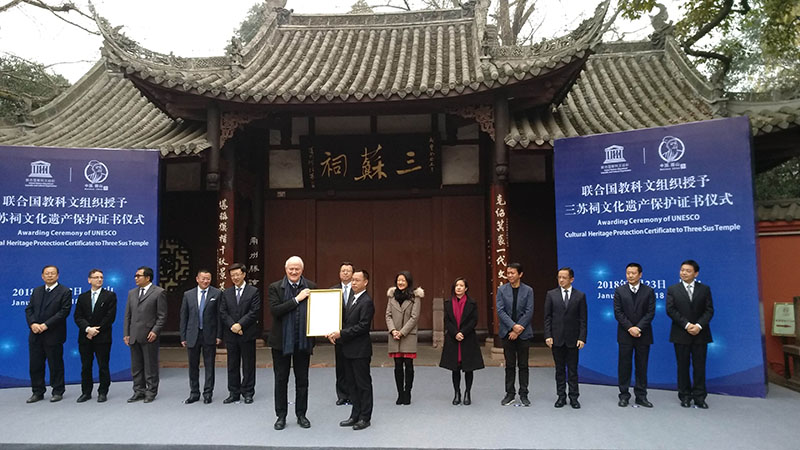 央廣網(wǎng)成都1月23日消息(記者劉濤)中國世界文化遺產(chǎn)又新增一處——1月23日,聯(lián)合國教科文組織正式授予四川眉山三蘇祠文化遺產(chǎn)保護(hù)榮譽(yù)證書。