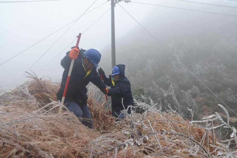 1月28日早上,寒潮持續(xù),南方電網(wǎng)廣東韶關(guān)城區(qū)供電局技術(shù)人員正在防冰特巡。
