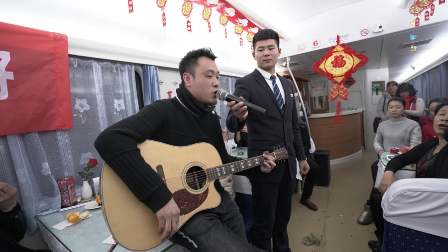 當(dāng)天,為給乘車旅客營造更加溫馨舒適的乘車環(huán)境,讓旅客享受更加美好的旅行生活,列車工作人員自編自導(dǎo)自演,精心準(zhǔn)備了包括相聲、小品、戲曲、歌舞等節(jié)目的“列車春晚”,為大家送上了傳統(tǒng)文化大餐。6歲的小旅客叢培悅按捺不住心里的喜悅,與列車工作人員一起載歌載舞,喜迎新年。