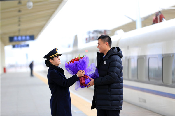 “列車即將進(jìn)站,請牽好小孩,站在安全線以內(nèi)……”9時25分,在G5397次高鐵列車即將進(jìn)站前,吳夏璐拿著擴(kuò)音器不斷地喊話,提示旅客站在正確的乘車位置?粗衙Φ猛2幌聛,林超手拿玫瑰花,悄悄地走到站臺中部位置,靜靜地等著。待到工作間隙,他加快步子奔到女友面前,將早已準(zhǔn)備好的鮮花遞給了她,并一把將她擁到懷里,輕輕說了一句“節(jié)日快樂,辛苦了!”