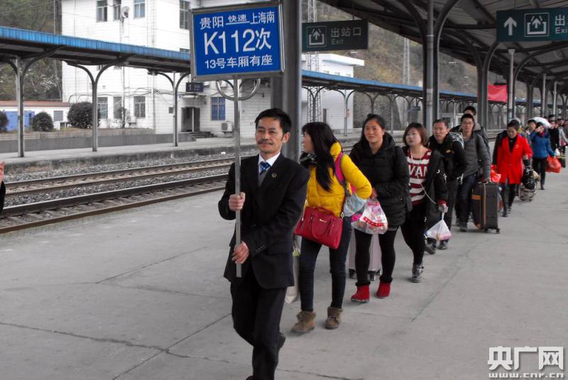貴州省福泉火車站的春運客流高峰來得早,旅客拖家?guī)Э、或結伴而行,車站站臺上,返程的景象一片忙碌路。