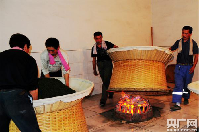 制茶人員在高溫下拉老火,翻茶