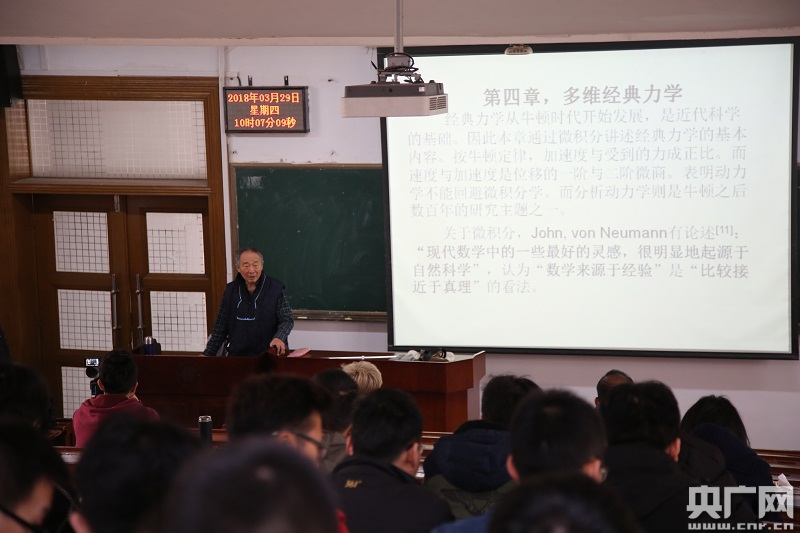 央廣網(wǎng)大連4月17日消息(記者張四清 賈鐵生 通訊員呂東光)新學(xué)期,每周一、周四10時05分,一位老者拄著拐、步履仍舊穩(wěn)健,走進一公共大教室,教室里坐滿了學(xué)生,老先生底氣十足,思維敏捷,理論解析、公式推導(dǎo)娓娓道來。