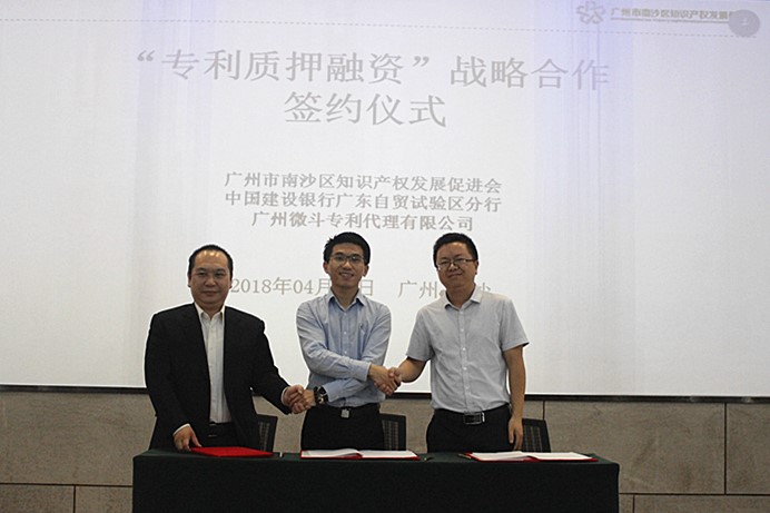 央廣網(wǎng)廣州4月20日消息(記者鄭澍)4月20日,在2018廣州南沙區(qū)知識(shí)產(chǎn)權(quán)宣傳周活動(dòng)上,南沙區(qū)知識(shí)產(chǎn)權(quán)發(fā)展促進(jìn)會(huì)(廣東省維權(quán)援助中心南沙分中心)聯(lián)合廣州微斗專利代理有限公司、中國建設(shè)銀行廣東自貿(mào)試驗(yàn)區(qū)分行在南沙樂天云谷路演中心舉行了“協(xié)會(huì)+專業(yè)機(jī)構(gòu)+銀行”三方聯(lián)動(dòng)的專利質(zhì)押融資戰(zhàn)略合作的簽約儀式。