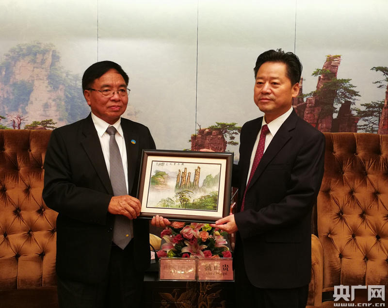 張家界市委書記虢正貴(右)與老撾省委書記訪問團團長坎堅·馮珀西友好交流