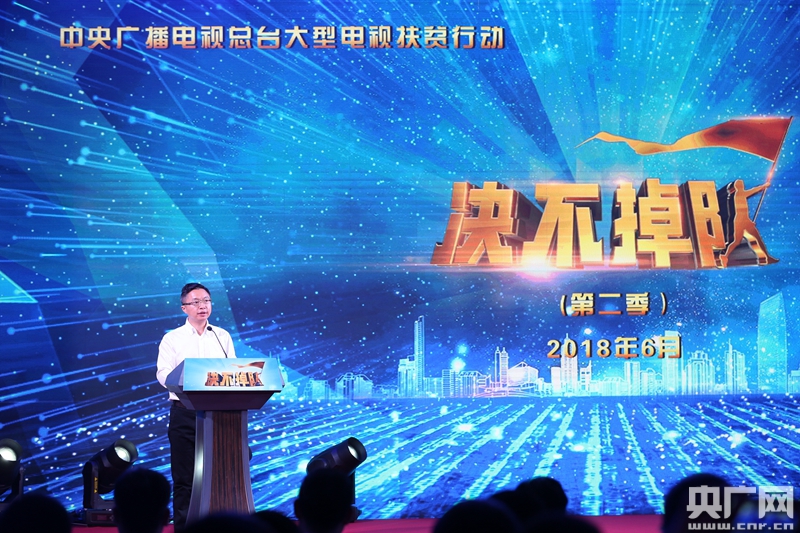 央廣網(wǎng)北京6月6日消息(記者 蔡波)2018年6月5日,中央廣播電視總臺大型電視扶貧行動《決不掉隊》第二季節(jié)目啟動儀式在北京梅地亞中心舉辦。中央組織部、中央宣傳部、中央統(tǒng)戰(zhàn)部、文化和旅游部、工信部、審計署、國務(wù)院扶貧辦、中國殘疾人聯(lián)合會和中華全國供銷合作總社等中央和國家機關(guān)有關(guān)部委領(lǐng)導(dǎo),以及北京市扶貧協(xié)作和支援合作辦公室、重慶市萬州區(qū)、貴州省畢節(jié)市、西藏自治區(qū)墨脫縣、陜西省平利縣、甘肅省渭源縣、河北省淶源縣、云南省昭通市昭陽區(qū)、青海省囊謙縣、山東省棗莊市嶧城區(qū)、貴州省安順市西秀區(qū)等單位和地方領(lǐng)導(dǎo),以及200多位專家、扶貧企業(yè)和主流媒體等參加節(jié)目啟動儀式。