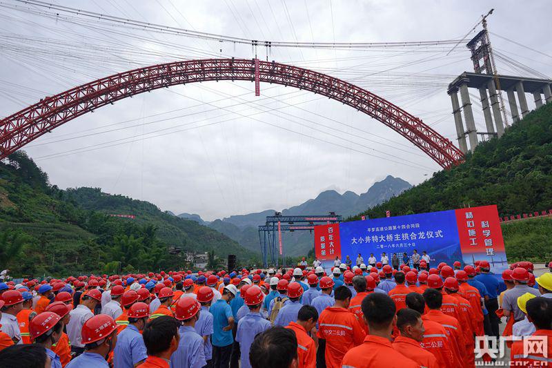 央廣網(wǎng)貴陽7月1日消息(記者張兆福)昨天上午,貴州黔南州平塘到羅甸高速公路大小井特大橋傳來捷報,隨著最后一節(jié)鋼管吊裝安裝就位,世界最大跨徑上承式鋼管混凝土拱橋主拱圈順利合龍。這標志著“世界橋梁博物館”的貴州再次刷新世界記錄,又添一座世界級橋梁。大小井特大橋?qū)Φ、桂、黔石漠化集中連片特困地區(qū)的脫貧攻堅有重要推動意義。