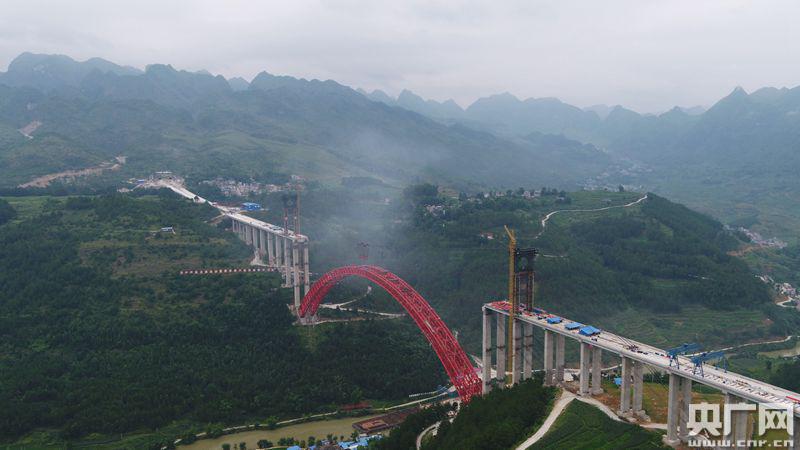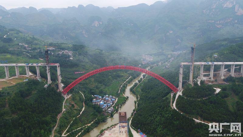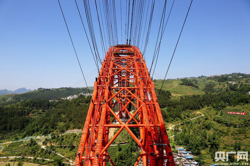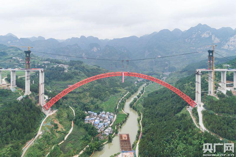作為我國典型的高山峽谷大跨度鋼管拱橋和世界同類型橋梁之最,大小井特大橋結(jié)構、技術復雜,質(zhì)量要求高。貴州橋梁建設集團有限責任公司總工程師張勝林介紹,施工單位克服了地形陡峭、大體積混凝土澆筑、毫米級焊接拼裝精度控制等難題。大橋主拱圈采用無支架纜索吊裝施工工藝!八^上承式就是行車道板在拱的上面,在貴州高速公路跨越U型河谷拱橋就是首選的橋型。拱橋?qū)嵤┕に嚫鼜碗s,它的好處是總體的橋長會短一些,如果要修建一個斜拉橋,總體的橋長就會很長,橋越長造價就越高。”