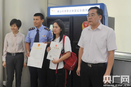 徐女士(右二)領(lǐng)取到廣東省首張?jiān)谏淌碌怯涀灾K端機(jī)上打印的“營(yíng)業(yè)執(zhí)照”