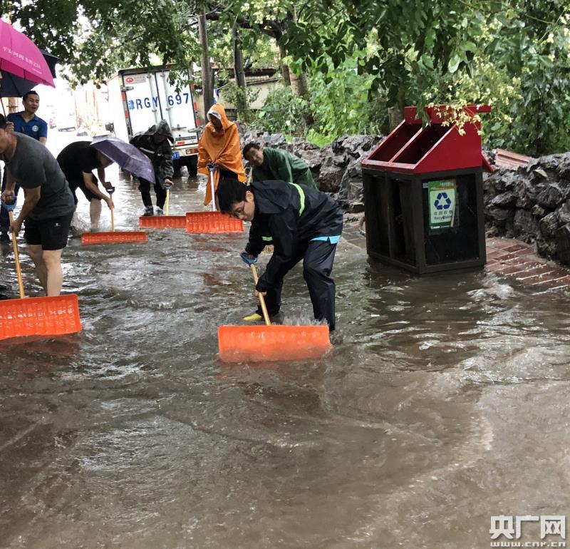 河西區(qū)陳塘莊街社區(qū)黨員干部在微山西里社區(qū)幫助居民人工排水。(央廣網(wǎng)發(fā) 李軒攝)