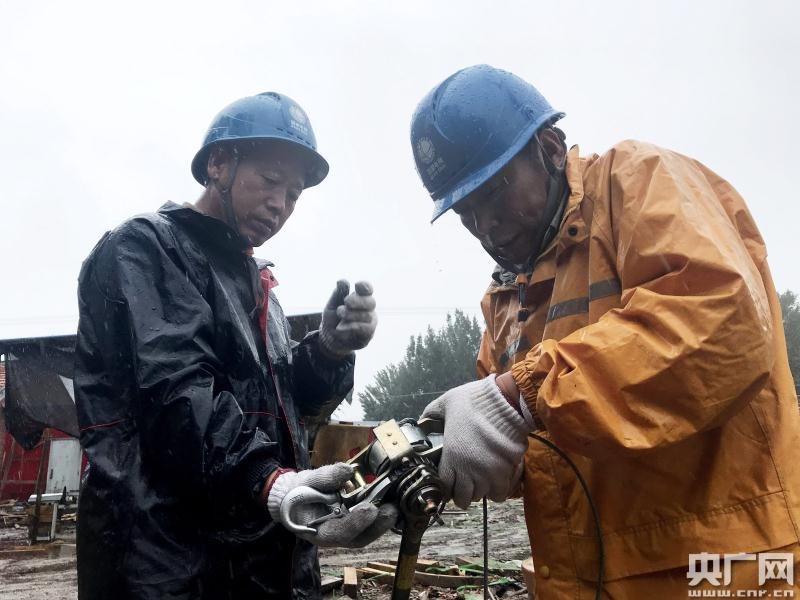 國網(wǎng)天津?qū)氎婀締T工冒雨開展故障搶修。(央廣網(wǎng)發(fā) 李博雯 攝)