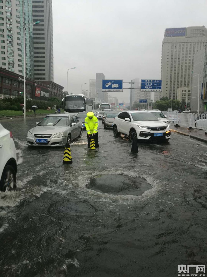 天津交警密切關(guān)注積水情況,防止車輛誤入發(fā)生危險。(央廣網(wǎng)發(fā) 劉媛 攝)