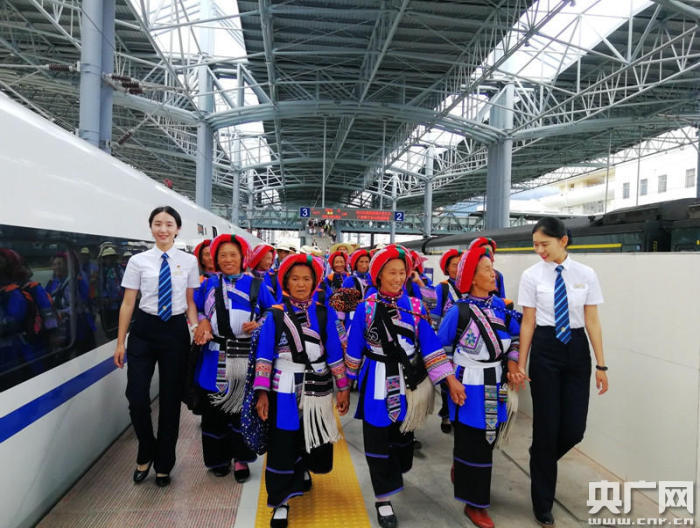 彝族群眾在大理站幸福體驗昆楚大鐵路動車出行(央廣網(wǎng)發(fā) 李喜喜 攝)