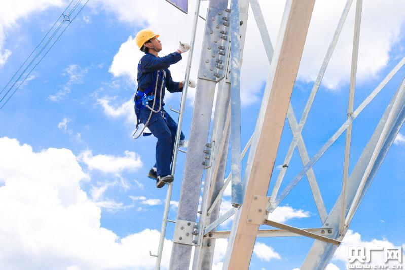 烈日高溫下,南方電網(wǎng)廣東云浮供電局員工正專注地進(jìn)行接線,確保用戶正常用電。(央廣網(wǎng)發(fā) 周燊平 攝)
