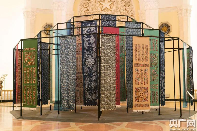 一走進上海展覽中心,沉浸式公共藝術裝置《百鳥林》便吸引了眾多人的目光,置身林間,鳥鳴啾啾,令人難忘!栋嬴B林》如其名,匯集了各種鳥類形象,而這些形象與眾不同,它們運用了大江南北四種非遺織染繡藝,分別是藍印花布、丹寨蠟染、阿壩羌繡、苗族百鳥依,營造了一個非遺傳統(tǒng)手工藝的鳥林天堂,行走其中,鳥鳴聲聲,此起彼伏,宛若在百鳥啼鳴的森林中穿梭,意趣盎然。上海大學上海美術學院副教授上海公共藝術協(xié)同創(chuàng)新中心運營總監(jiān)章莉莉介紹,這個裝置里面一共有兩位國家級傳承人的共同合作,還有一位是丹寨蠟染的老師,張居悅老師,“我們用合作的意識,探索的精神,去實踐非遺傳承的創(chuàng)新的道路。”