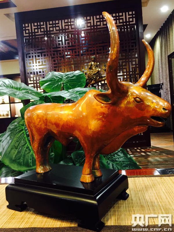 在珍品館里,土金勇向記者介紹了五件特殊的作品——孔雀明王、孔雀瓶、五型爐、仿古牛和大犀牛?上,記者目前無(wú)緣在此看到原品。因?yàn)樵缭?986年,國(guó)家輕工部就將這五件云南斑銅定為“工藝美術(shù)珍品”,將它們收藏于中國(guó)工藝美術(shù)館。1997年香港回歸時(shí),由昆明市斑銅廠承制的“吉祥孔雀瓶”作為云南政府賀禮贈(zèng)送香港特區(qū),獲得香港同胞和業(yè)界的高度贊譽(yù)。而大犀牛等作品又被作為國(guó)禮漂洋過(guò)海贈(zèng)給了外國(guó)元首。