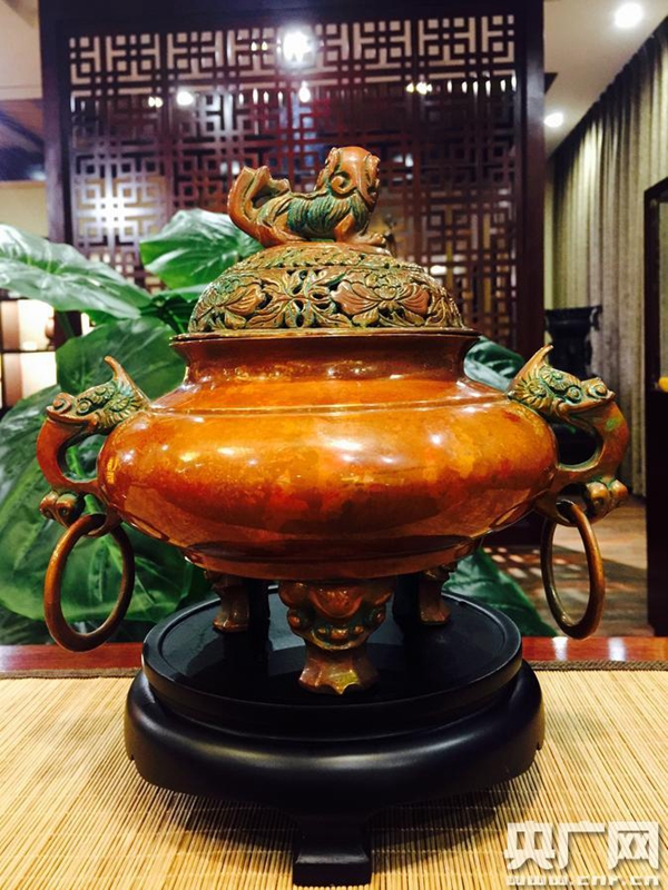 土金勇介紹,三百多年來(lái),斑銅一直承襲著古代青銅“重器”的文化符號(hào),過(guò)去不是出現(xiàn)在一些重要的場(chǎng)合和儀式中,就是出現(xiàn)在達(dá)官貴人、文人雅士的身邊。直到上世紀(jì)80年代,斑銅才開(kāi)始走進(jìn)大眾日常的生活,現(xiàn)在也有一部分作為旅游商品面市。