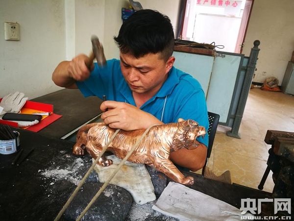 那時(shí),廠區(qū)有兩位師傅正分別制作一虎、一馬兩件作品。特別是制虎的那邊,古銅色的虎軀被麻繩固定起來(lái)經(jīng)受鏨刻鍛打,而微微回轉(zhuǎn)的虎首正睥睨著師傅,仿佛它立刻便能掙脫束縛,回歸山林。在還是頗為粗陋的銅坯上,力的曲線和動(dòng)感已在流淌,藝術(shù)的生命呼之欲出。土金勇告訴記者,銅本身是冰冷的,但以廠里工藝大師制作的懸崖孔雀為代表,生動(dòng)甚至夸張的造型、光影色調(diào)的巧妙搭配賦予了作品更多個(gè)性與溫度,這是其它金屬工藝無(wú)法比擬的。
