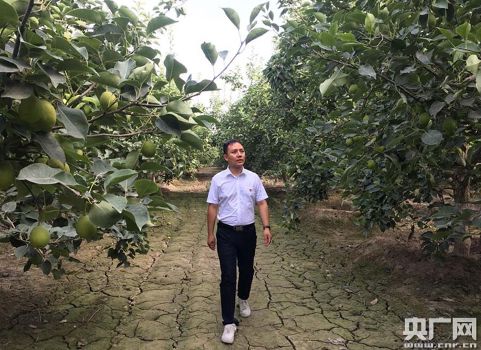 金冠華走在林果地,調(diào)研當(dāng)?shù)亓止N植和外銷(央廣網(wǎng)記者 吳卓勝 攝)