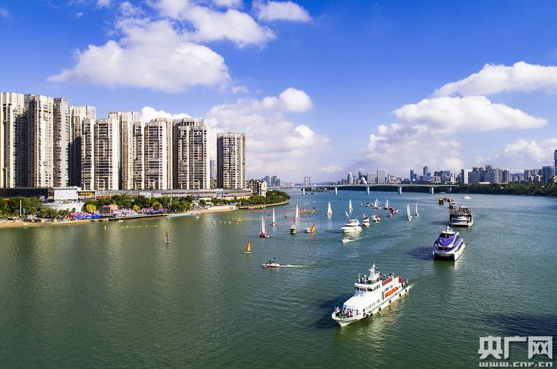 柳州國際水上狂歡節(jié)期間,水上巡游編隊在柳江上進行狂歡巡游(央廣網(wǎng)發(fā) 李斌 攝)