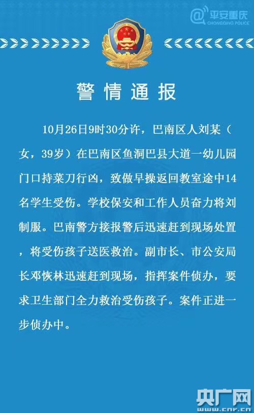 根據(jù)重慶市公安局官方發(fā)布的“警情通報”,犯罪嫌疑人劉某,女,39歲,在巴南區(qū)魚洞巴縣大道一幼兒園門口持菜刀行兇,致做早操返回教室途中14名學生受傷。學校保安和工作人員奮力將劉某制服。巴南警方接報警后迅速趕到現(xiàn)場處置,將受傷孩子送醫(yī)救治。副市長、市公安局長鄧恢林迅速趕到現(xiàn)場,指揮案件偵辦,要求衛(wèi)生部門全力救治受傷孩子。案件正在進一步偵辦中。
