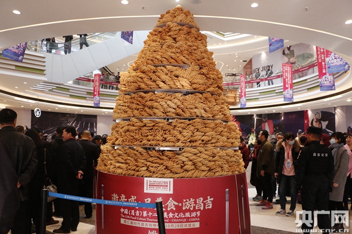 由馕和馓子組成的巨型“美食塔”(央廣網(wǎng)見習(xí)記者 韓雪瑩 攝)