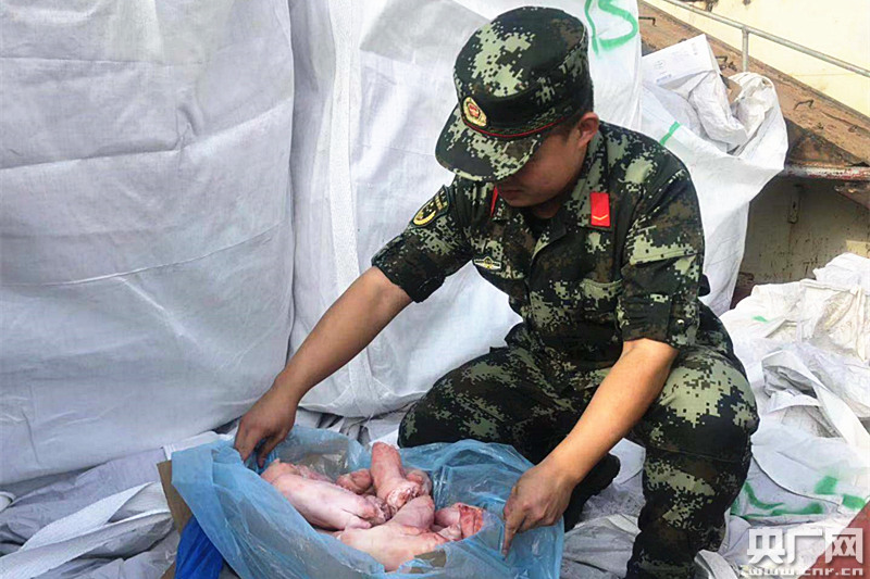 海警官兵現(xiàn)場檢查凍品。(央廣網(wǎng)發(fā) 廣東海警一支隊 供圖)