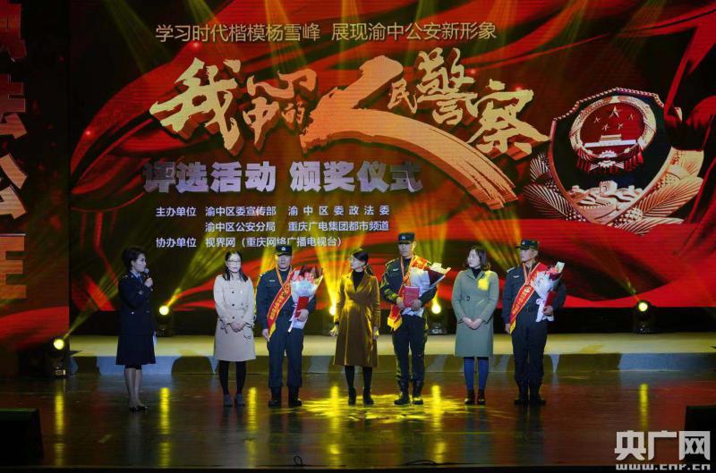 11月9日下午15時,渝中公安“學(xué)習(xí)時代楷模楊雪峰,展現(xiàn)渝中公安新形象——‘我心中的人民警察’”評選活動頒獎典禮在兩路口文化宮正式舉行。群眾的投票得票前十名的高萬祿等10人被評為群眾心中的“十佳民警”,趙新等排前20名的民警被評為群眾心中的“優(yōu)秀民警”。獲得榮譽(yù)的民警,紛紛上臺發(fā)表感言,并接受頒獎。人大代表、黨代表、政協(xié)委員、警風(fēng)監(jiān)督員、轄區(qū)群眾代表及民警等千余人參加典禮。