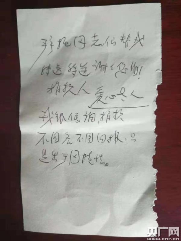 姜老師手書紙條,表示捐款不圖回報(bào)(央廣網(wǎng)發(fā) 甬派記者 攝)