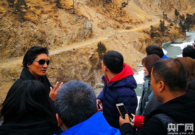 雪山鄉(xiāng)鄉(xiāng)長旦正才讓在現(xiàn)場介紹當年修公路的情形(央廣網(wǎng)記者 張雷 攝)