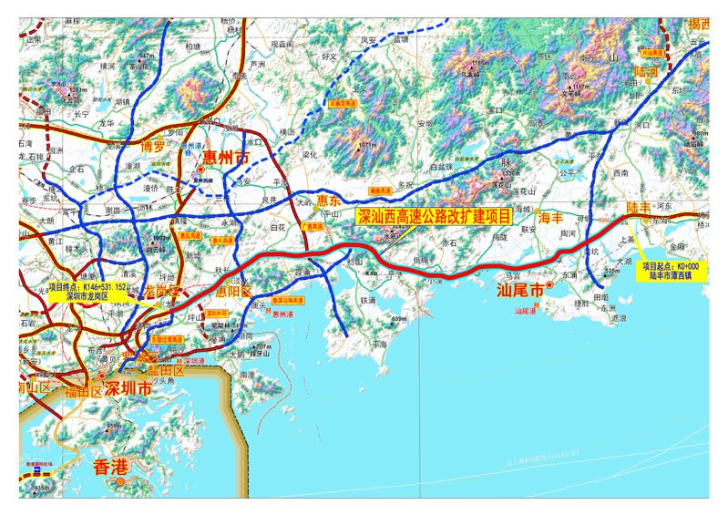 深汕西高速公路改擴(kuò)建項(xiàng)目全長約 146.6公里,路線起于陸豐市潭西鎮(zhèn),順接深汕東高速公路,沿現(xiàn)有高速公路走向,經(jīng)汕尾市、深汕特別合作區(qū),惠州市,終于深圳市龍崗區(qū),順接惠鹽高速公路深圳段。