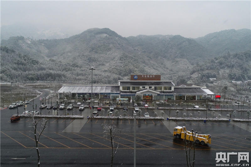 12月29日雪中的雅康高速天全服務(wù)區(qū)(央廣網(wǎng)發(fā) 四川省交通運(yùn)輸廳供圖)