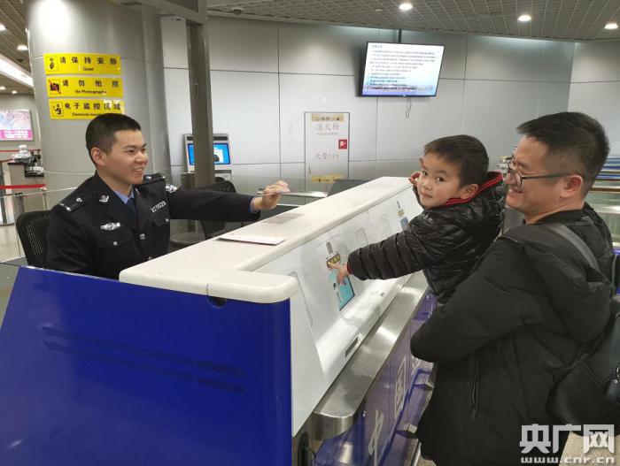 身穿帶有移民局標(biāo)識服裝的民警為旅客服務(wù)(央廣網(wǎng)發(fā) 陳燕 攝)