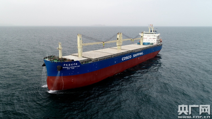 央廣網(wǎng)大連1月11日消息(記者張四清 賈鐵生 通訊員張善殊)1月11日上午,大連中遠海運重工設(shè)計建造的多用途紙漿船“中遠海運開拓”輪命名交付。該船為中國船廠建造交付的最大多用途紙漿船,載重可達6.2萬噸。船舶能在除南北極外的全球海域航行,不僅可運送紙漿,還可運送高鐵列車、風電設(shè)備、大型機械設(shè)備、超長超重鋼管樁結(jié)構(gòu)等,其航線的廣泛性及運輸多樣性,對世界港口貿(mào)易及城市建設(shè)發(fā)展有積極的推動作用,助推“一帶一路”合作共贏。