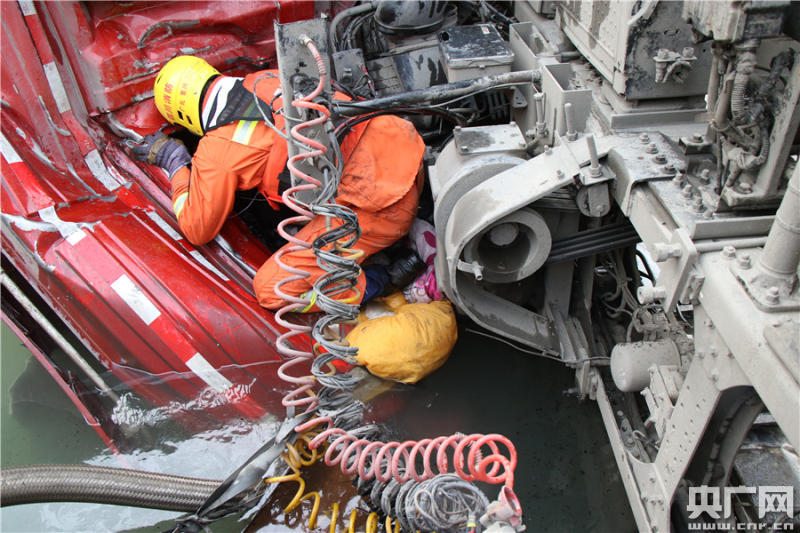隨后,救援人員迅速制定救援方案,第一小組穿戴好個人防護裝具乘坐橡皮艇在事故車輛上查看是否有人員被困;第二組待確定人員被困位置后尋找可開展救援的位置對駕駛室進行破拆、擴張。由于河水渾濁、水位過高,中隊救援人員無法尋找到可供擴張的支點,經(jīng)過反復勘察,指揮員命令救援隊員從車窗位置涉水深入駕駛室內(nèi)部進行救援,救援隊員在河水中經(jīng)過兩個小時的救援,成功將第一名被困人員救出。由于第二名被困人員被卡在駕駛室內(nèi),救援人員在水面上無法將其救出,隨后聯(lián)系吊車將事故車輛起吊至路面,救援人員在吊車的配合下,于20時50分左右將第二名被困人員救出,經(jīng)現(xiàn)場120醫(yī)務人員確認已無生命跡象。