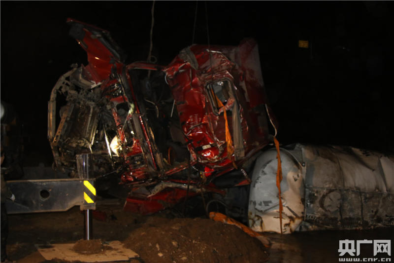 救援人員到達現(xiàn)場后發(fā)現(xiàn),一輛水泥罐車側(cè)翻于涼水大橋下的河中央,水面距離大橋約20米,事故車輛車頭已經(jīng)嚴重變形,車窗玻璃完全破碎,車頭大部分沒入渾濁的河水中。救援人員經(jīng)詢問了解到車內(nèi)有兩人被困。