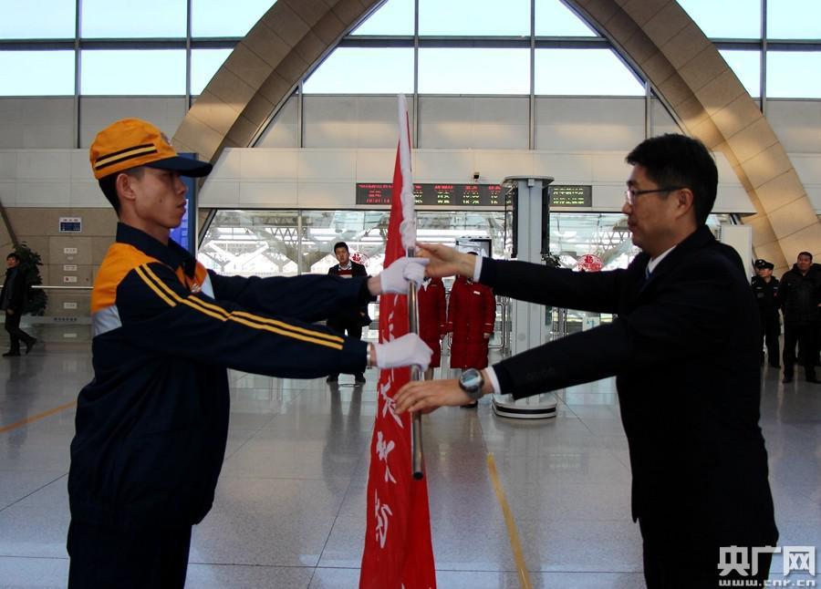 春運(yùn)志愿者授旗(央廣網(wǎng)發(fā) 閆軍拍攝)