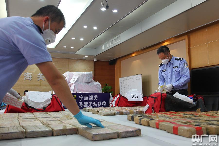 2018年10月17日寧波海關緝私警察清點“10.16”毒品案涉案毒品(央廣網(wǎng)發(fā) 寧波海關供圖)