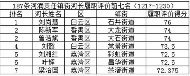 同時(shí),本期公布了187條河涌鎮(zhèn)(街)河長履職評價(jià)前七名和村(居)級河長履職評價(jià)前十名名單。另外,本期河長履職情況整體不錯較上月都有明顯進(jìn)步,為此本期暫不曝光最后幾名。鎮(zhèn)(街)級河長履職前七名分別是:白云區(qū)石井街道劉尚慧、番禺區(qū)大龍街道陳新軍、番禺區(qū)大石街道曾浩斌、白云區(qū)棠景街道劉懿、荔灣區(qū)彩虹街道劉湘紅、荔灣區(qū)昌華街道葉輝、荔灣區(qū)茶滘街道梁治國。村(居)級河長履職前十名分別是(個別分?jǐn)?shù)一樣):番禺區(qū)小谷圍街道屈哨兵、荔灣區(qū)嶺南街道和平社區(qū)居民委員會蕭潔雯、花都區(qū)新雅街道雅瑤舊村村委會鄧榮添、番禺區(qū)南村鎮(zhèn)塘西村民委員會邵豪英、花都區(qū)新雅街道廣塘村委會劉杞良、花都區(qū)新雅街道石塘村委會黃河燎、荔灣區(qū)昌華街道西關(guān)大屋社區(qū)居民委員會何敏婷、越秀區(qū)東山街道樂景社區(qū)居民委員會劉春苗、荔灣區(qū)嶺南街道清平社區(qū)居民委員會劉雯雯、荔灣區(qū)西村街道增埗社區(qū)居民委員會胡勇山、番禺區(qū)大龍街道茶東村民委員會曹英權(quán)、荔灣區(qū)南源街道環(huán)翠園社區(qū)居民委員會梁曉華、番禺區(qū)鐘村街道鐘村四村民委員會盧杰洪、花都區(qū)新華街道新街村委會曾超波。